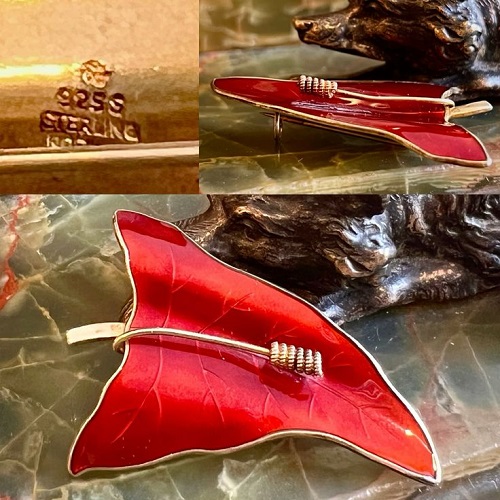 Vintage sterling red enamel triangular leaf pin—vermeil and measuring 2” long and 1-5/8” across at top of the leaf, circa 1950s, made in Norway by O.F. Hjortdahl of Oslo